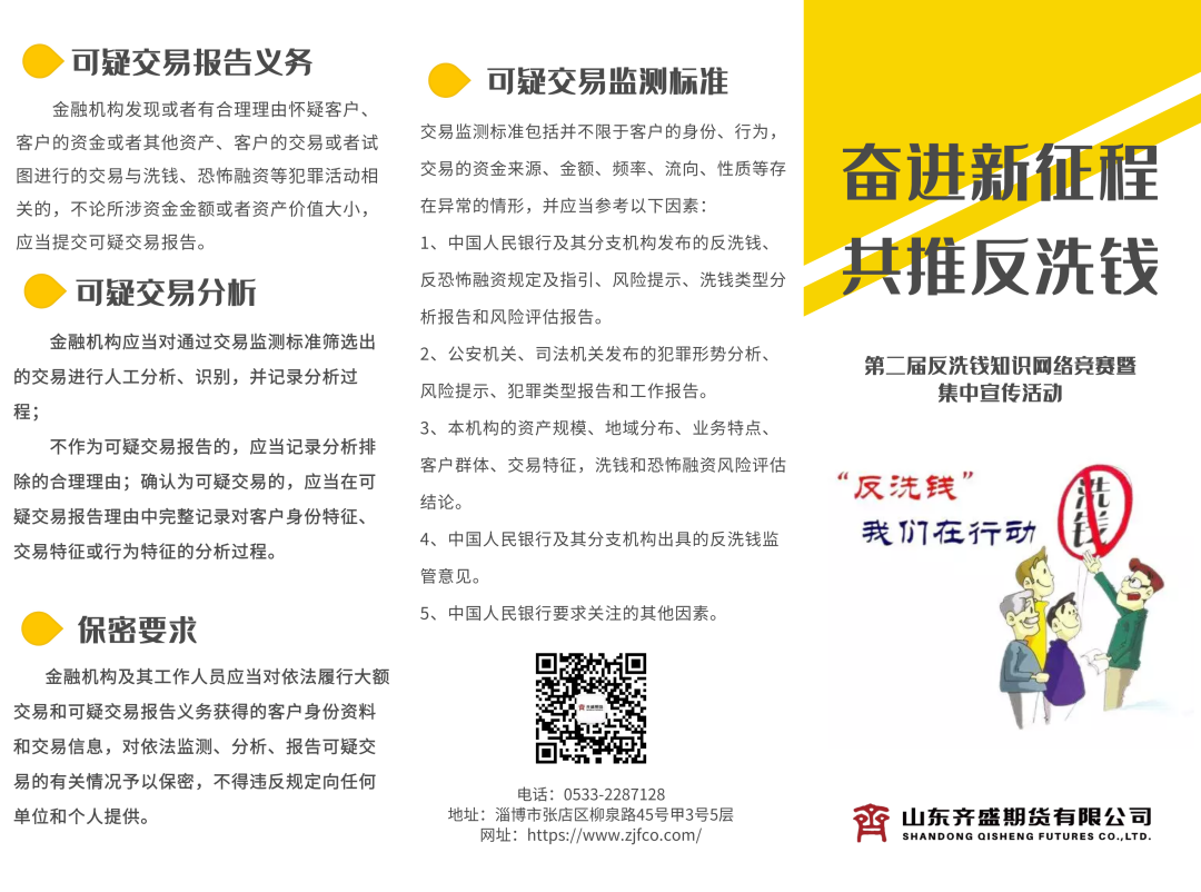 活動(dòng)期間,集團(tuán)公司法務(wù)風(fēng)控部聯(lián)合齊盛期貨公司積極投入到此次“奮進(jìn)新征程 共推反洗錢”活動(dòng)工作中,通過(guò)印制宣傳折頁(yè)、擺置宣傳海報(bào)、全員答題、制作反洗錢微視頻等方式,增強(qiáng)反洗錢活動(dòng)宣傳力度和覆蓋范圍。